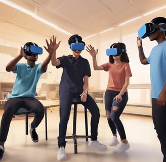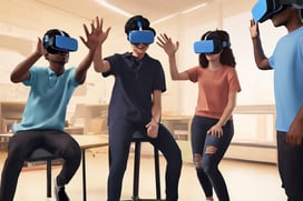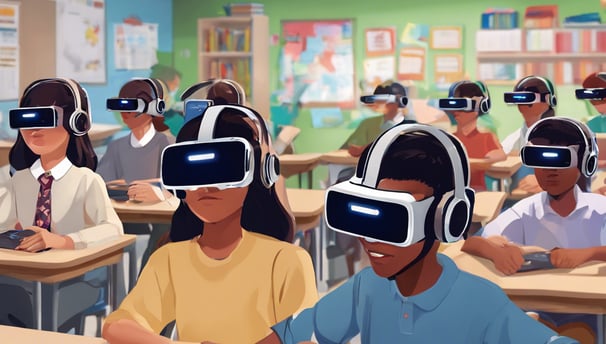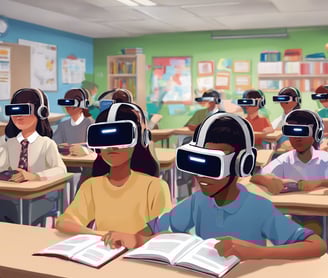 Students wearing VR headsets, immersed in a virtual learning environment.
